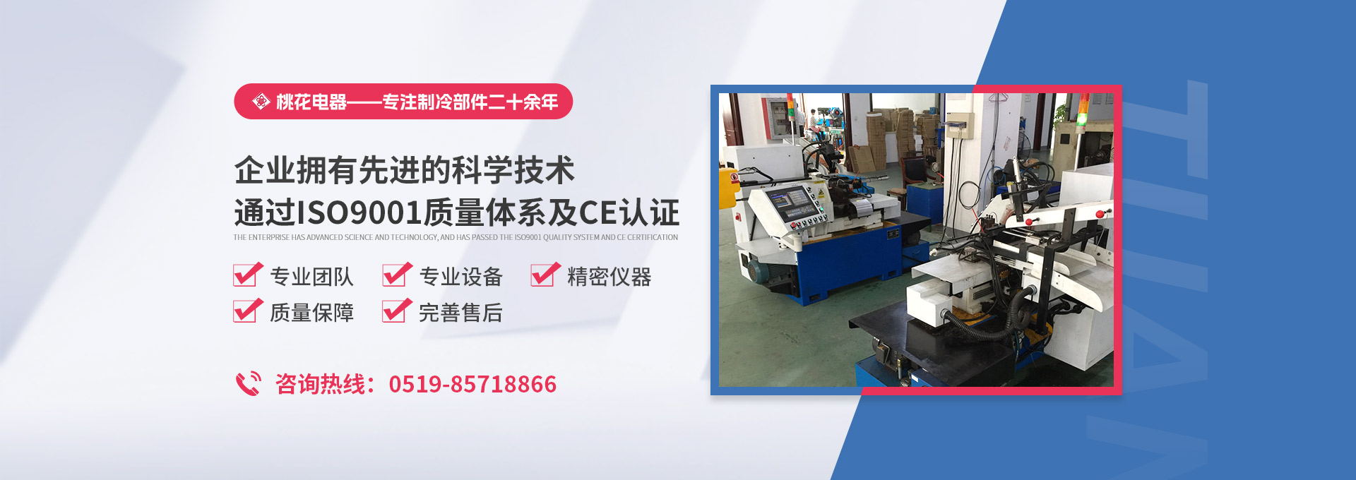 常州桃花電器有限公司地處中國長江“金三角”之稱的上海至南京高速公路、城際高鐵、常州高新經濟技術開發區路段,交通便利、技術力量十分雄厚。它是集研究、開發設計、制造和經營制冷核心部件的企業,主要生產中央空調上使用的制冷部件。產品有膜片式單向閥、鋼球式單向閥、四氟式單向閥、過濾器、消音器等系列。年生產制冷核心部件200萬只,其性能達到國際同類產品水平。  企業擁有先進的科學技術、國際先進的生產加工設備和精密的檢測儀器,并已通過ISO9001質量體系及CE認證,公司歷史悠久,2000年起,經過長期積累、沉淀,經驗豐富,從而保證了產品的高質量、高性能、高耐用性。企業產品在國內外市場具有較高的知名度,深受眾多中外品牌制冷客商的好評。主要客戶有約克、麥克維爾、美的、開利、特靈、頓漢布什、清華同方、天加等.并出口北美、歐洲、東南亞等地區。  高品質產品是企業的保證,周到服務是合作友誼的承諾,企業本著“求